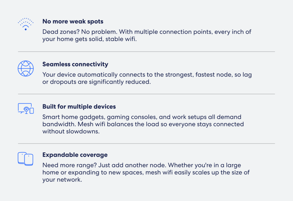 - No more weak spots – Dead zones? No problem. With multiple connection points, every inch of your home gets solid, stable wifi.